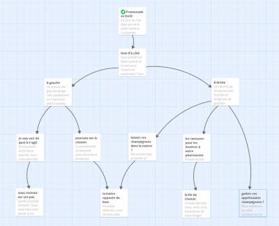 L'histoire Twine ci-dessous est l'enrichissement des versions linéaires vues dans les sections précédentes. La narration comprend à présent des choix menant à des fins différentes pour la plupart.